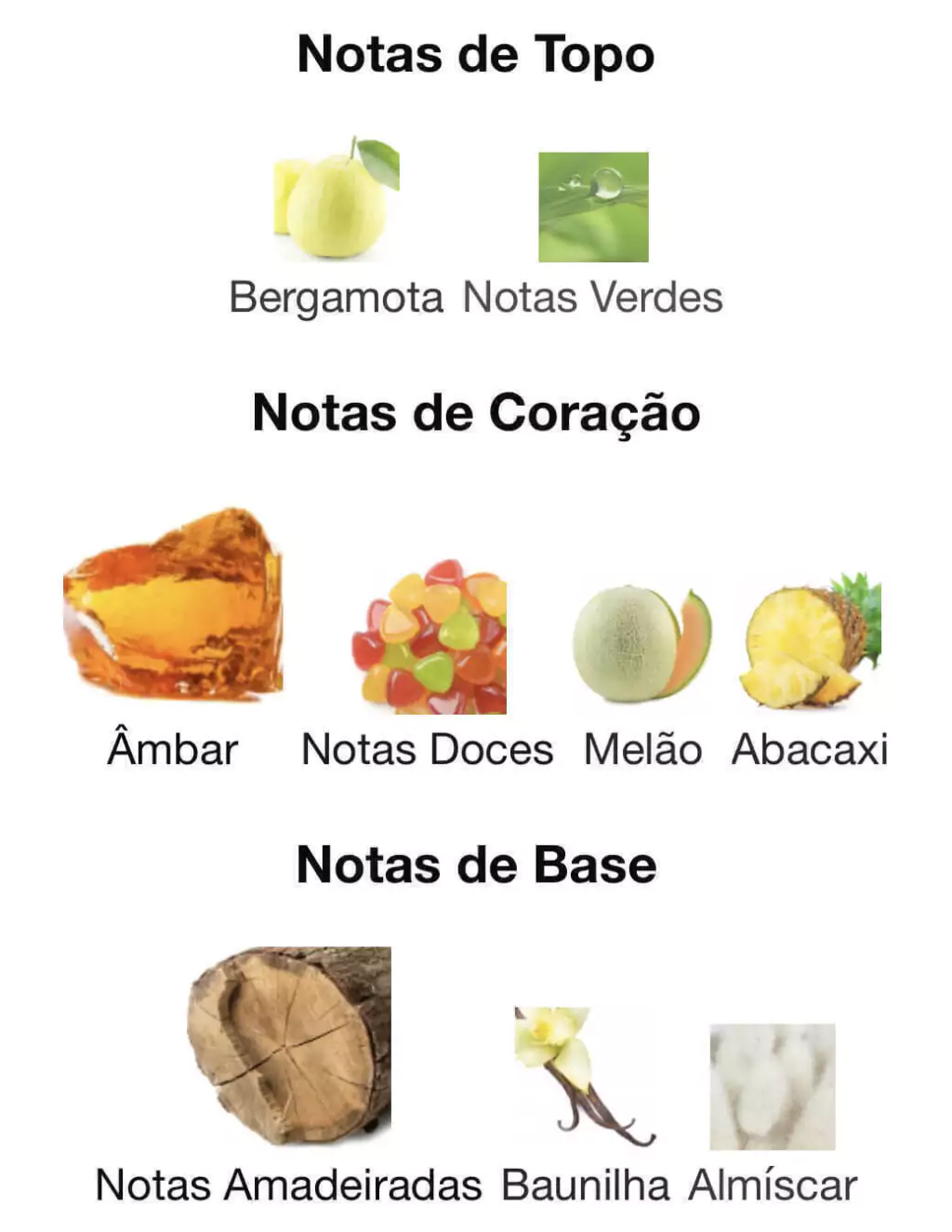 As notas de coração são: Notas Doces, Âmbar, Melão e Abacaxi. As notas de fundo são: Notas Amadeiradas, Almíscar e Baunilha.